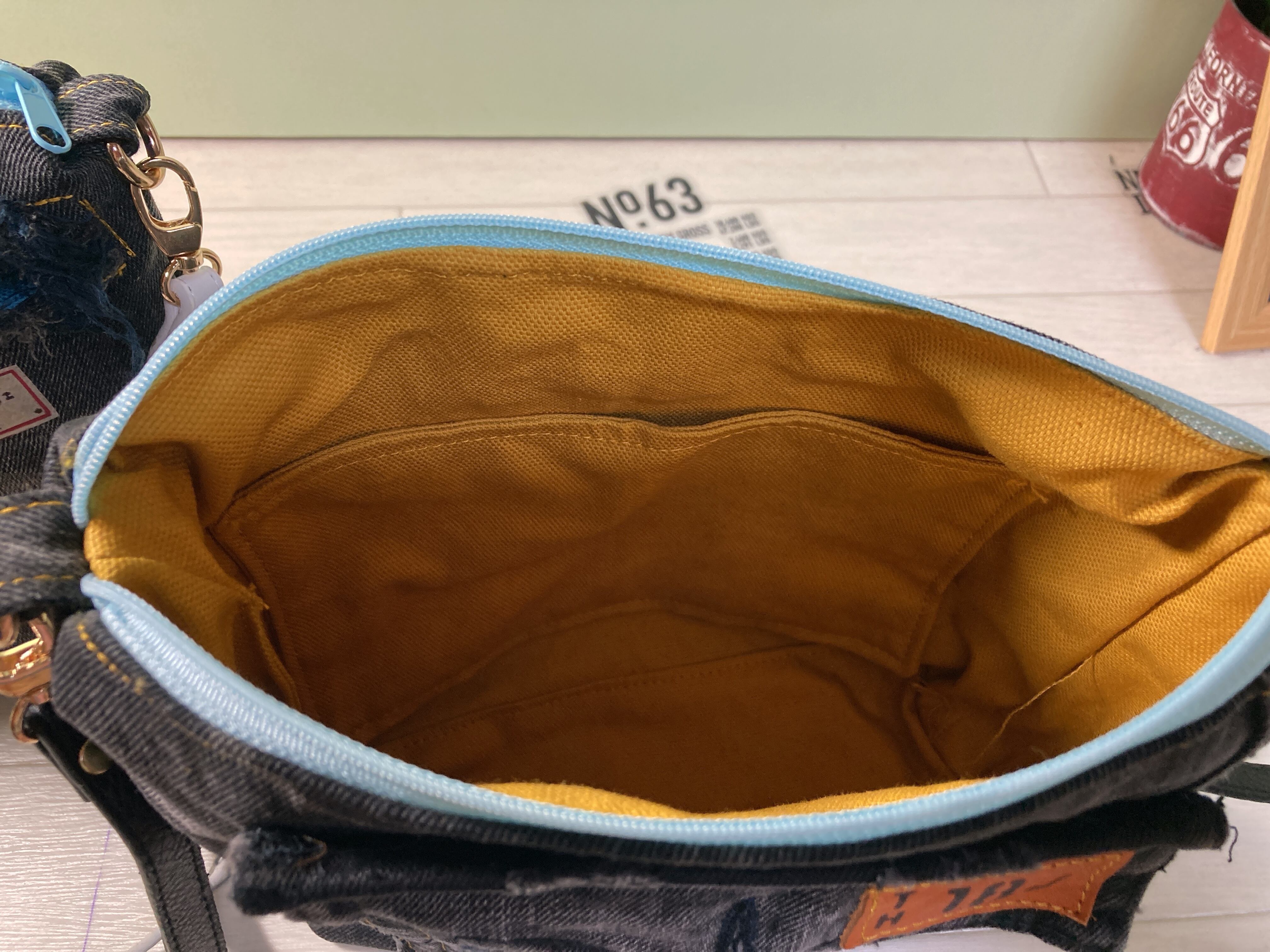 前のポケットは、デニムの後ろポケットを使ってあります。