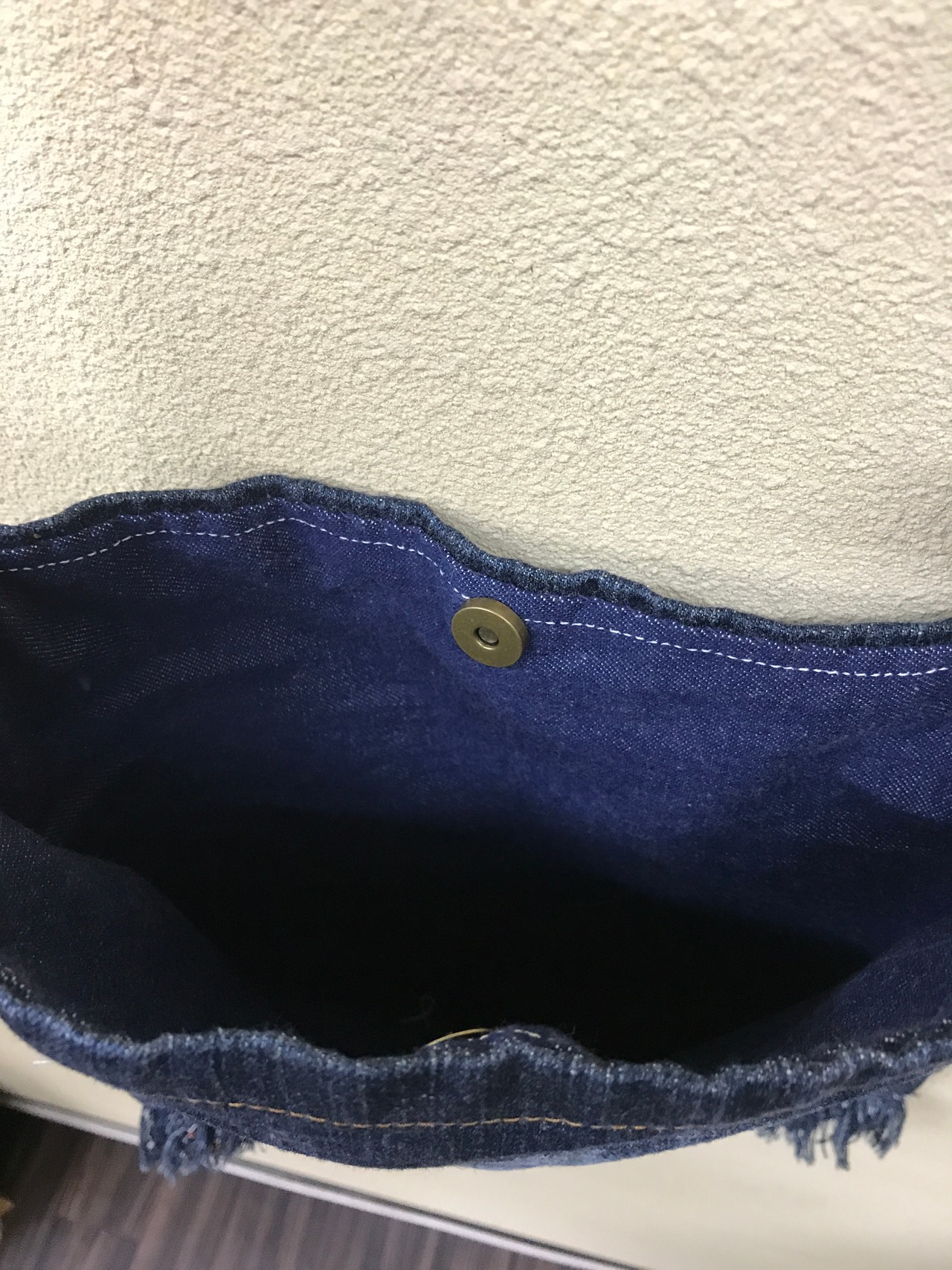 裏生地もデニム生地になります。磁石ボタンで止めれるようになってます。