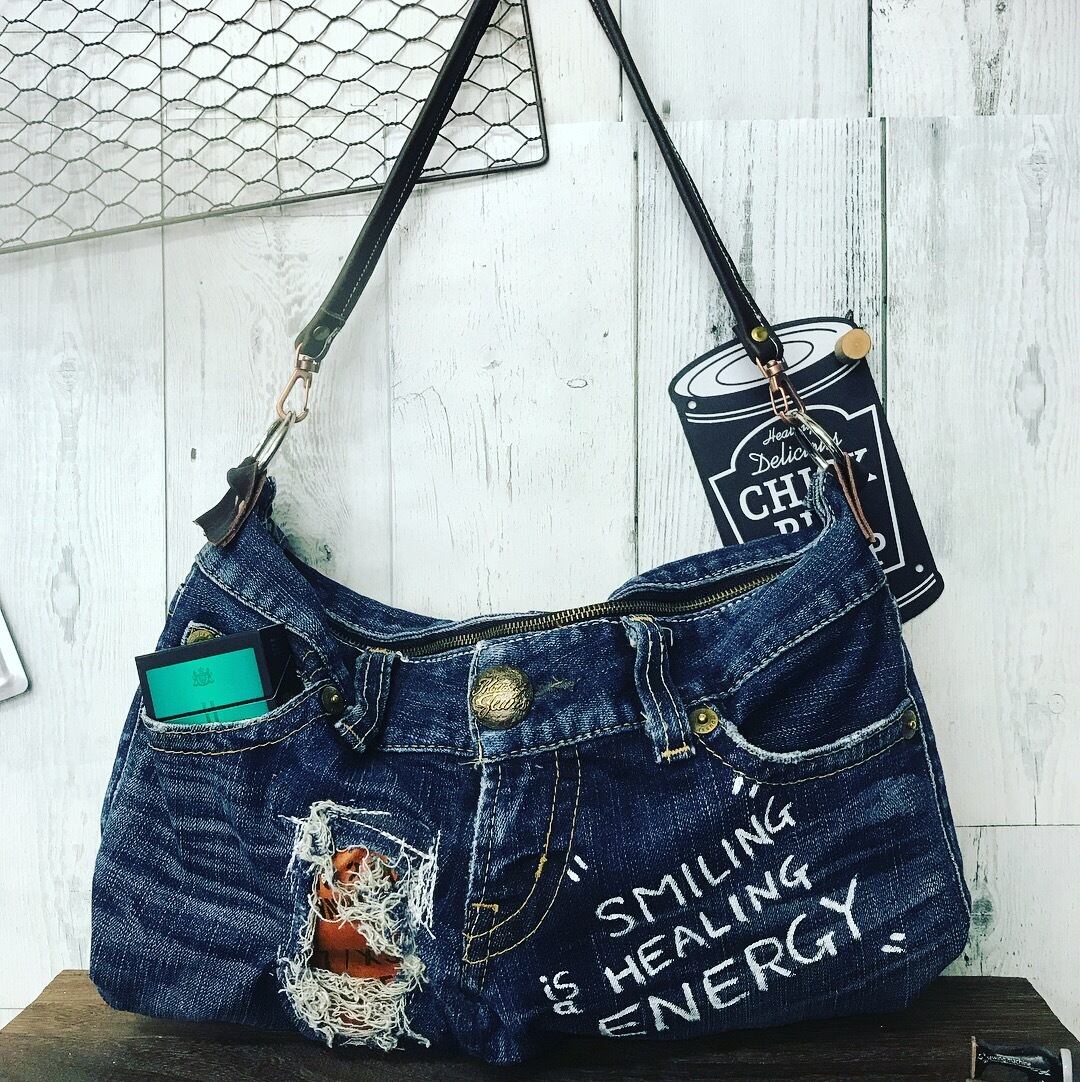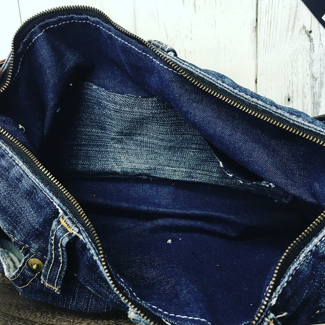 全体は、デニムのウエスト部分を使っています。ポイントにレザーをつけました。
